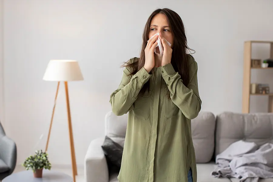 Во время пыления растений окна держите закрытыми, открывайте после дождя. Используйте специальный очиститель воздуха с HEPA-фильтром – он задерживает больше 99% частиц размером 0,3 мкм, включая пыльцу. Бельё сушите внутри помещения, не на балконе.